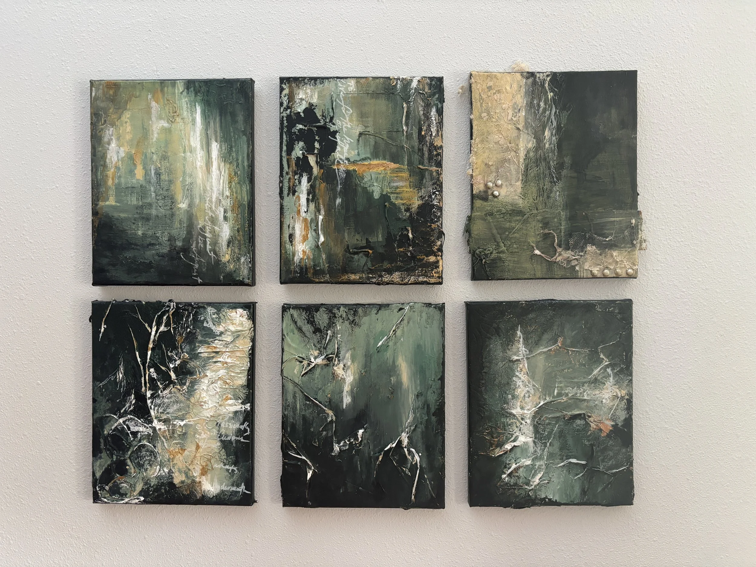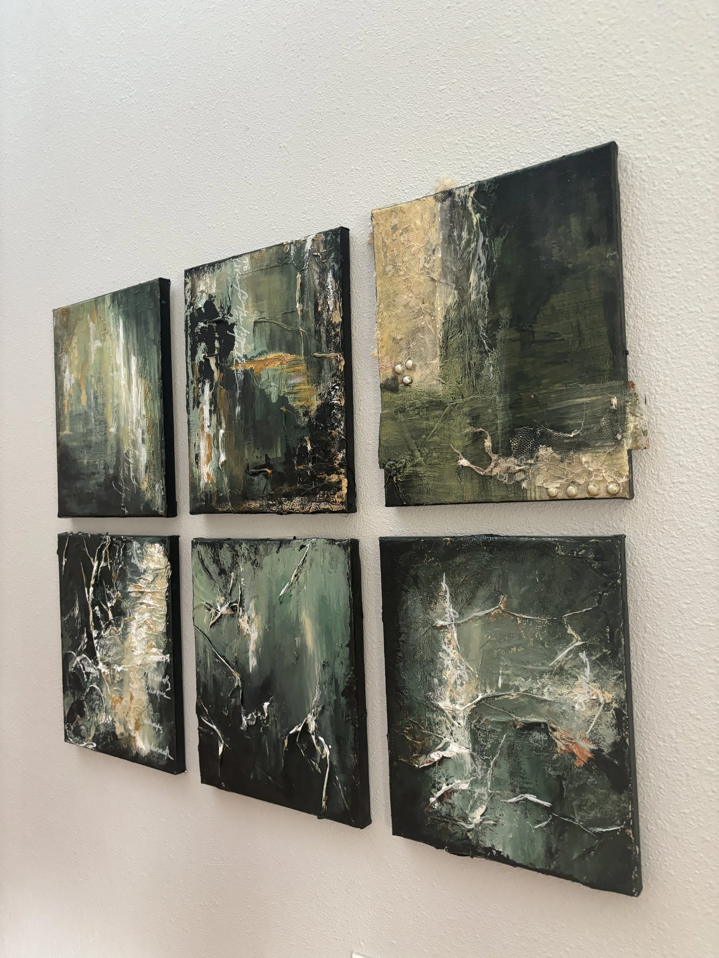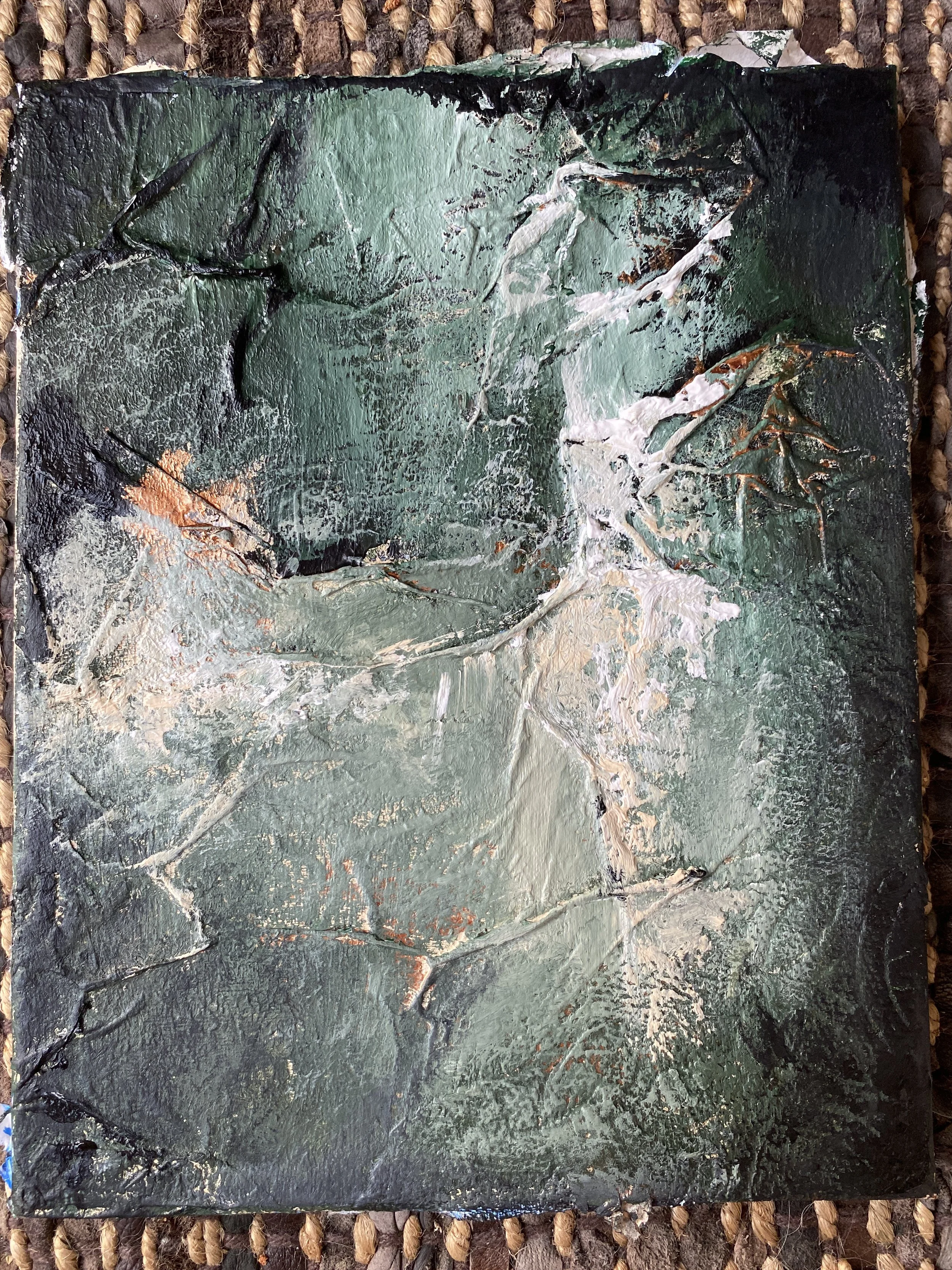 Continuing on with the idea of painting over old canvas that was a prevalent theme in the last collection, it was also the start of this body of work. Looking at an old idea in a new way. This collection began while I played around making these orange little minis, because I enjoyed minis after doing the first round and they are a nice change of pace after working on the big pieces. I felt inspired by the greens of late summer, in the river and on walks. By the lazy late summer sun reflecting in the river when its at its lowest of the season, when you can see the bottom and everything flowing through it. In Montana our rivers and lakes are super clear in the summer, especially when they are low. No longer is it a dark, mysterious black like in the beginning of summer. It’s more of a subtle, calm friendly version. Similar to a human, sometimes we are dark, deep, mysterious in life. Sometimes we are subtle, calm, friendly. It’s the combination of it all, that makes life interesting. The same river, but with many different facets. i think that speaks to us as humans, and our ability to be multi faceted. To like two things at once. to love the city, and also the mountains. To be outgoing and spontaneous, but need time alone to recharge. For some, to be a mother, and still their own person. To be spiritual, and still want to party. To be grounded, and still get lost in the depths of your dreams.