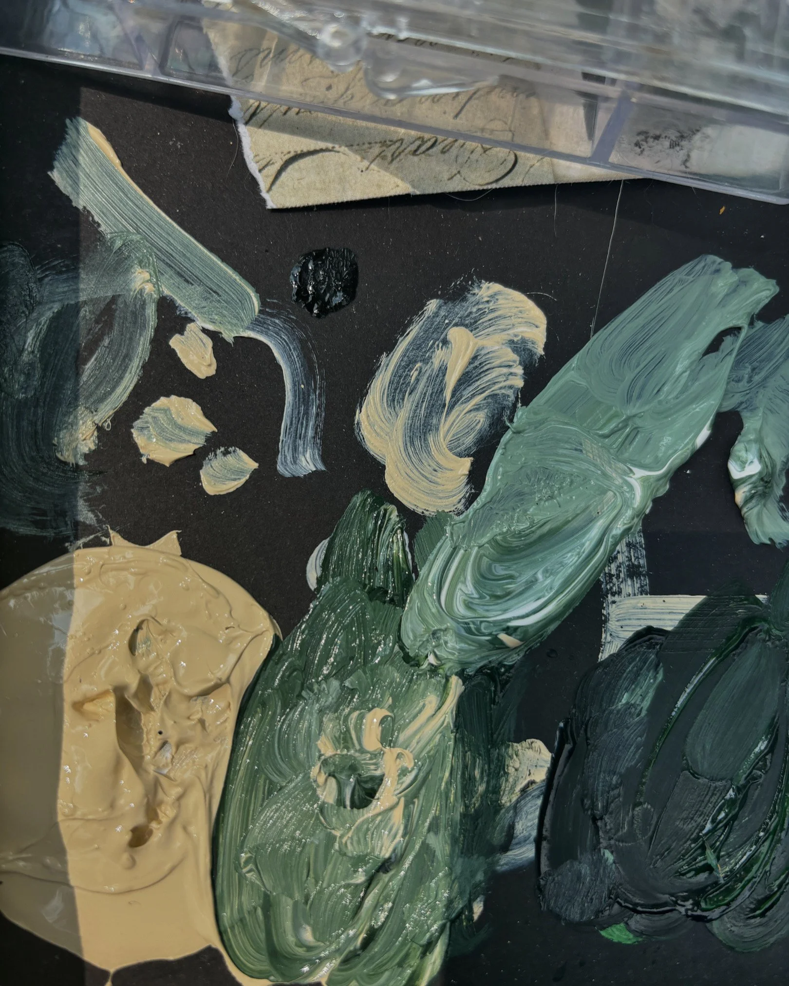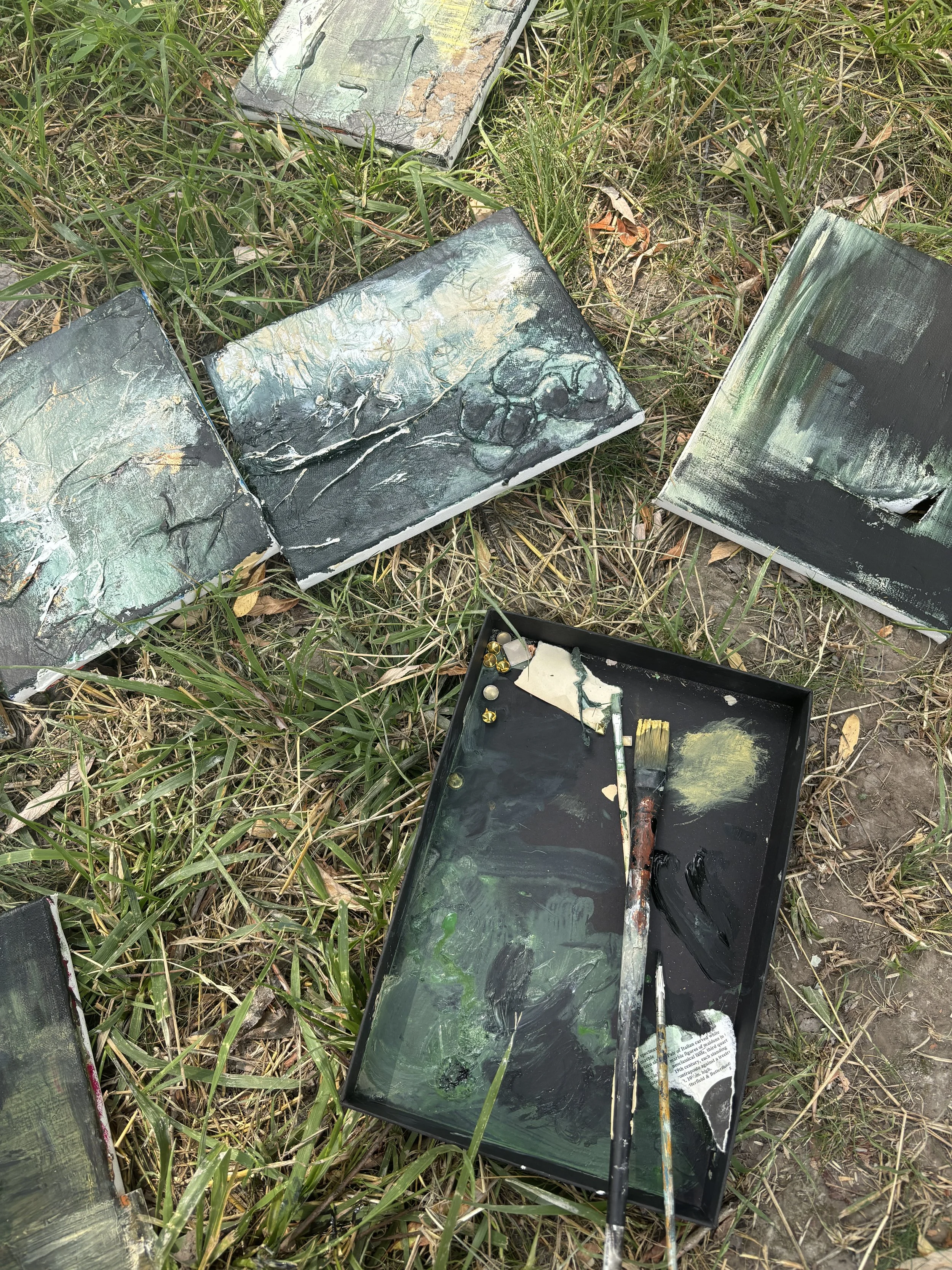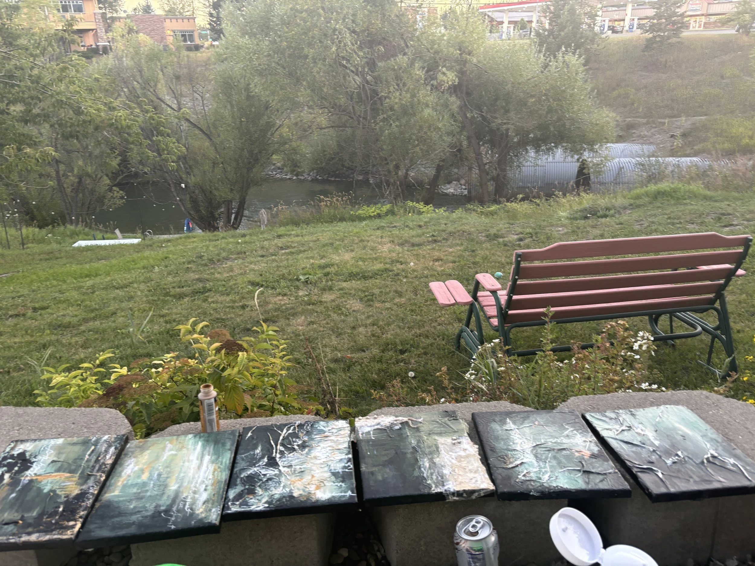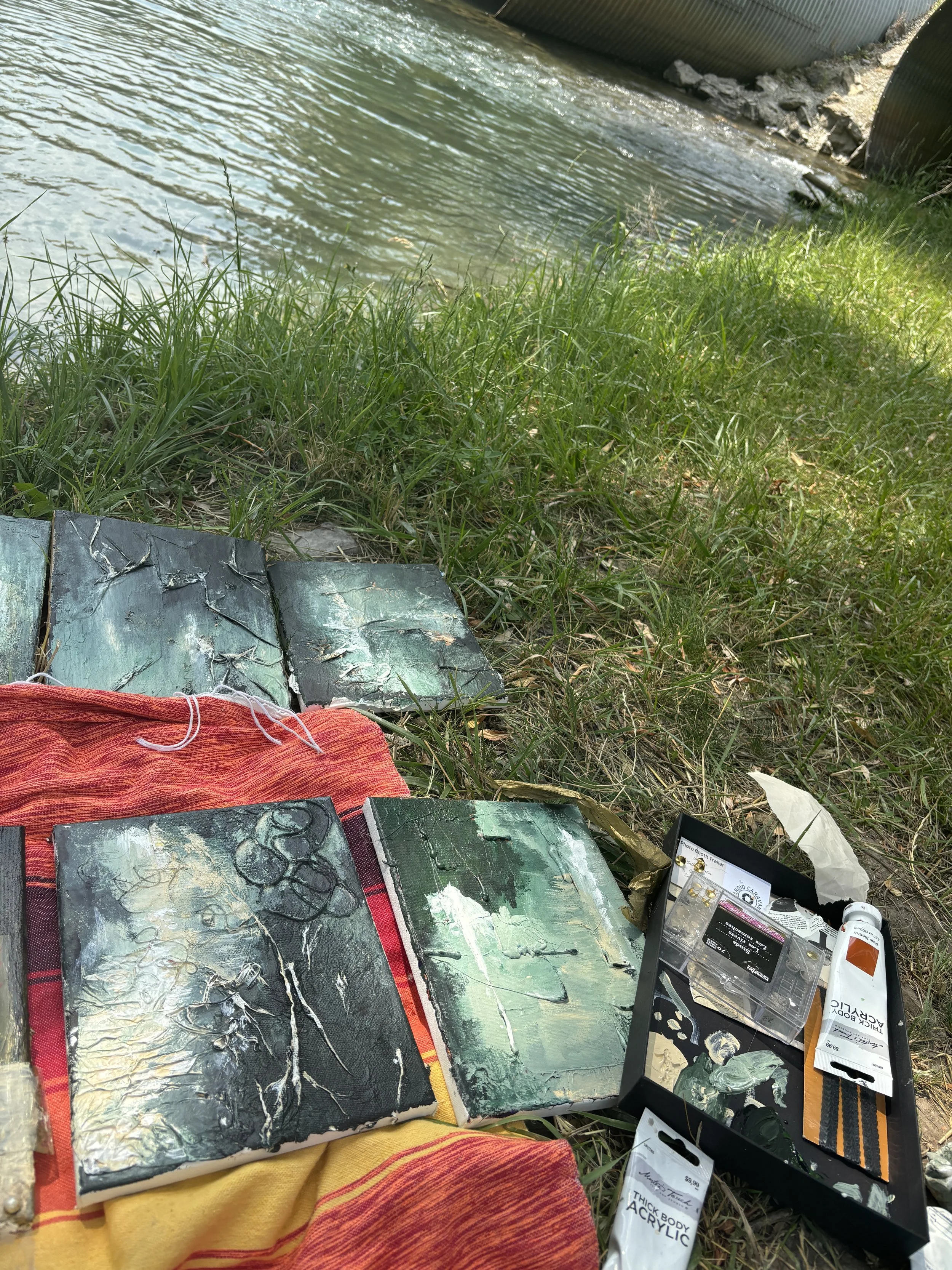 Continuing on with the idea of painting over old canvas that was a prevalent theme in the last collection, it was also the start of this body of work. Looking at an old idea in a new way. This collection began while I played around making these orange little minis, because I enjoyed minis after doing the first round and they are a nice change of pace after working on the big pieces. I felt inspired by the greens of late summer, in the river and on walks. By the lazy late summer sun reflecting in the river when its at its lowest of the season, when you can see the bottom and everything flowing through it. In Montana our rivers and lakes are super clear in the summer, especially when they are low. No longer is it a dark, mysterious black like in the beginning of summer. It’s more of a subtle, calm friendly version. Similar to a human, sometimes we are dark, deep, mysterious in life. Sometimes we are subtle, calm, friendly. It’s the combination of it all, that makes life interesting. The same river, but with many different facets. i think that speaks to us as humans, and our ability to be multi faceted. To like two things at once. to love the city, and also the mountains. To be outgoing and spontaneous, but need time alone to recharge. For some, to be a mother, and still their own person. To be spiritual, and still want to party. To be grounded, and still get lost in the depths of your dreams.